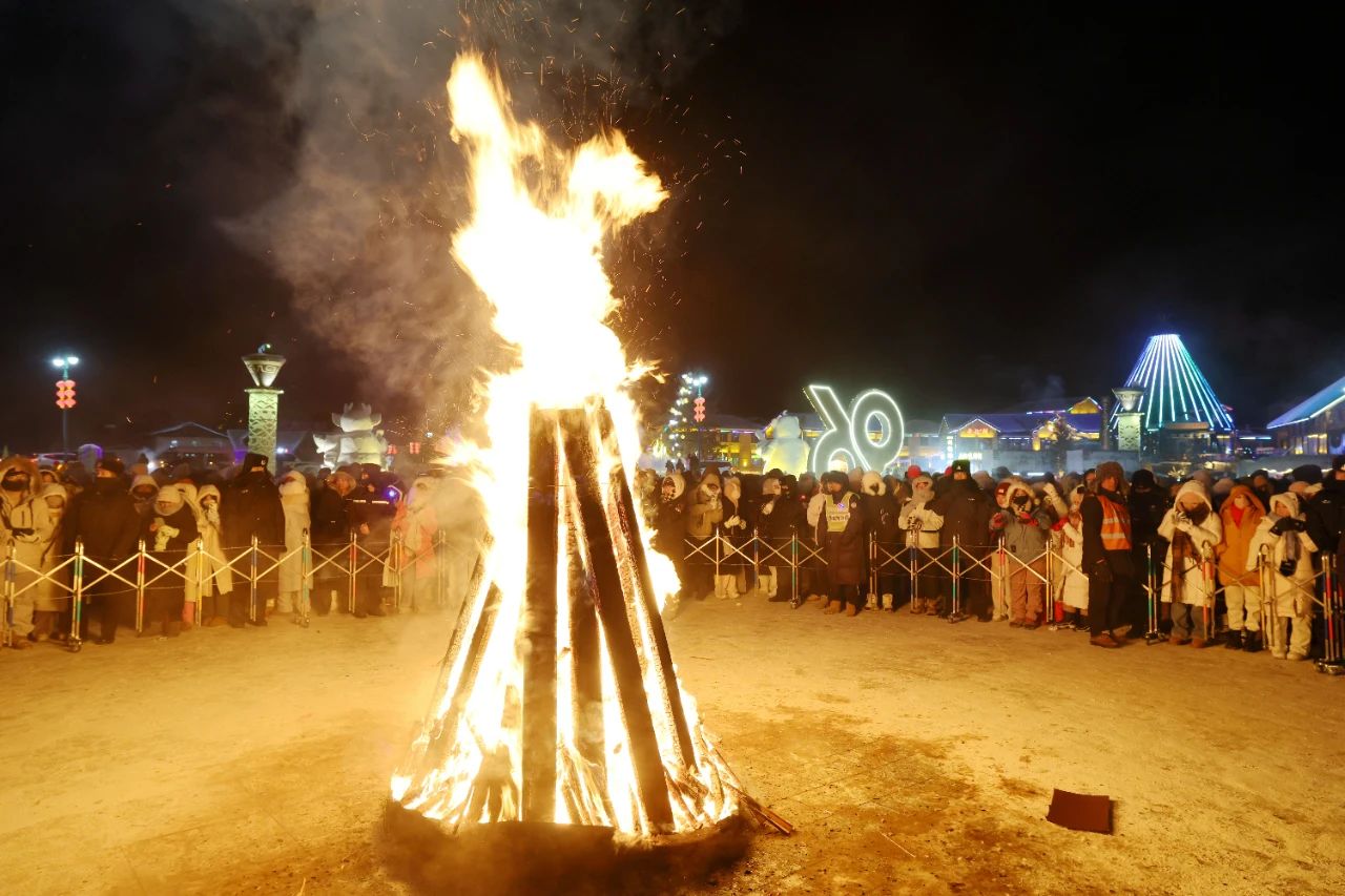 随着新年临近,全场倒计时响起,绚丽的烟花在夜空中粲然绽放,现场欢呼声此起彼伏,居民游客们共同迎接2025年的到来,许下新年的美好愿望。伴着熊熊燃烧的篝火,游客围绕着篝火载歌载舞,在冰天雪地中释放热情与活力,不断点燃跨年的激情。“祝大家新年快乐,事事如意,祝我们伟大的祖国繁荣昌盛。”福建游客金女士说。