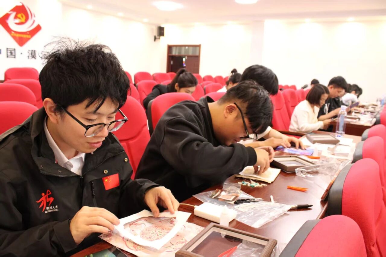 本次活动以“宋锦珍珠”这一特色非遗技艺为纽带,精准对接青年精神文化需求,旨在搭建一个释放青春活力、点燃文化热情的实践平台,助力青年在指尖造物的沉浸式体验中涵养文化底蕴、收获成长力量。活动现场,一幅幅缀满珍珠光泽的宋锦作品静静陈列,针脚间凝结着千年匠人的智慧结晶——这既是对传统技艺的崇高致敬,更是传统文化在当代实现创造性转化、创新性发展的生动缩影。