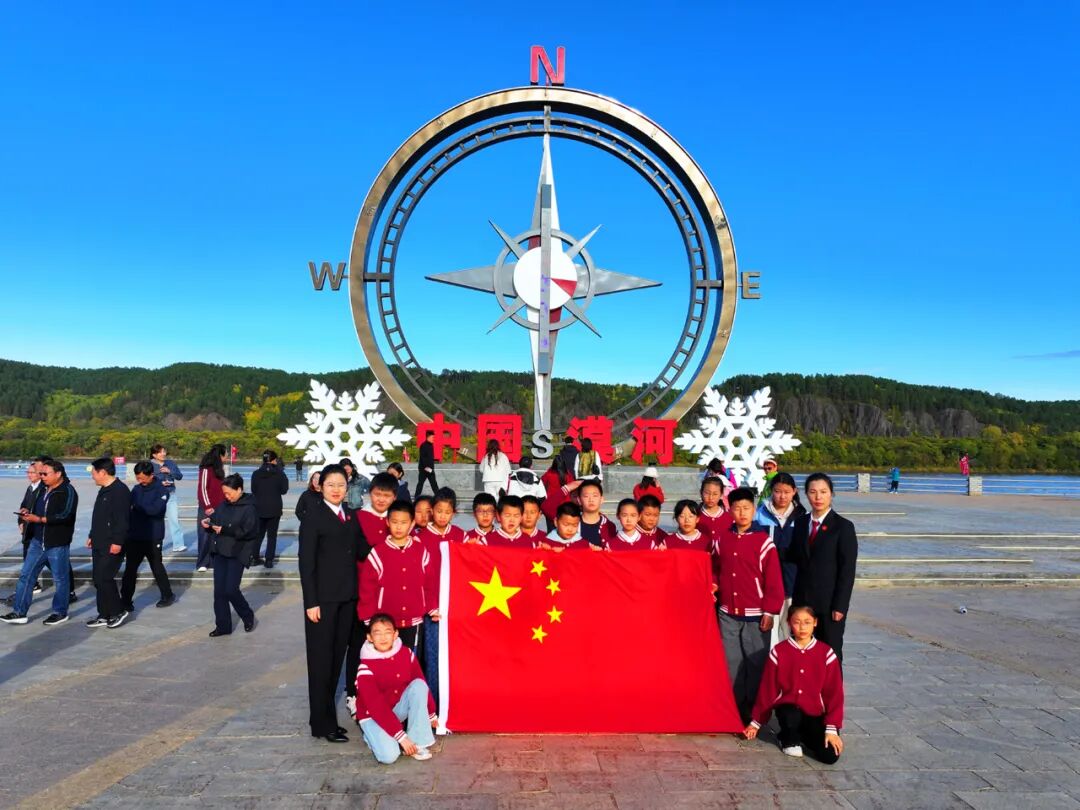 在中俄边境线上,师生共擎五星红旗,站立于界江前。法治副校长融合国防教育与法治教育,讲述法律对疆土和安全的守护。同学们触摸界碑、仰望国旗,法治精神与爱国情怀在孩子们的心中同频共振。
