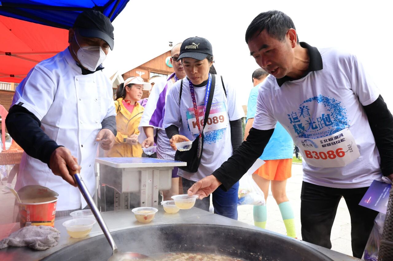 江鱼汤、排骨汤、羊杂汤、大列巴等各式东北美食让各地跑友大饱口福,感受中国最北的温暖。“这个汤喝起来新鲜美味,特别好喝,里面有一点盐分,正好可以给我们跑了半马的人补充点电解质。这一次的话,今天这个气温跟赛道特别适合PB,所以我今天PB,我估计自己算了一下,提高了8分钟。”福建选手王益宁说。